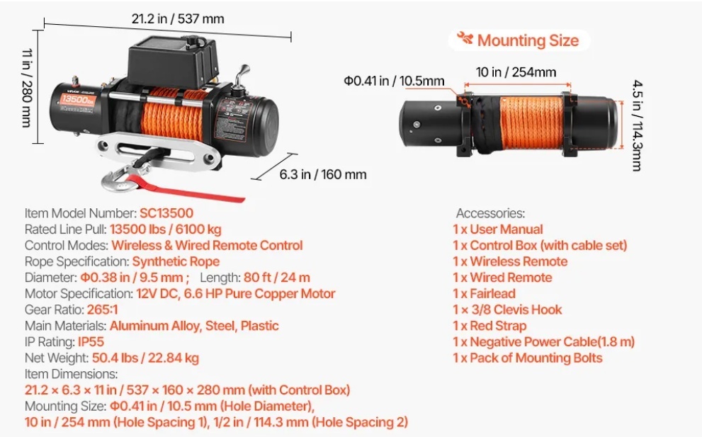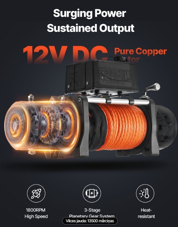 Īpaši izturīgajai kravas automašīnas vinčai ir 13500 mārciņu (7500 kg) vilkšanas jauda un IP55 ūdensnecaurlaidības klase, kas ir ideāli piemērota jūsu bezceļu transportlīdzekļu vai SUV atbrīvošanai no lipīgiem dubļiem vai stipra lietus. Ar 12 V līdzstrāvas/6,6 ZS vara motoru, 195,8:1 pārnesumu attiecību un sintētisko virvi jūs vienmēr esat gatavs.