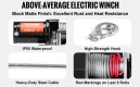 Mierīgs prāts. Vilkšanas veiktspēja: Skarbi laikapstākļi? Nav problēmu! Mūsu elektriskā vinča ir izgatavota ar IP55 ūdensnecaurlaidības pakāpi un gludu melnu matētu apdari, kas uzlabo izturību pret rūsu un izolāciju. Tā ir gatava tikt galā ar spēcīgu lietu, dubļiem vai citiem skarbiem apstākļiem. Krāsu kodēti strāvas kabeļi un viegli izpildāmas instrukcijas nozīmē, ka jūs varēsiet to uzstādīt bez aizķeršanās, lai jūs varētu atgriezties pie brauciena baudīšanas.