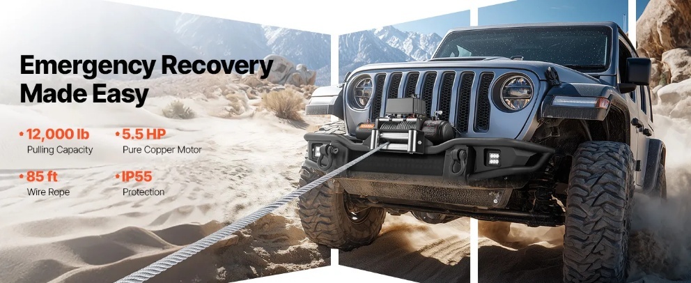 Jaudīga glābšana: Šis džipa vinčas 5,5 ZS motors ar 265:1 trīspakāpju planetāro pārnesumu nodrošina vienmērīgu vilkšanas spēku. Tas darbojas ilgas stundas bez pārkaršanas, nodrošinot uzticamu spēku glābšanai bezceļos.