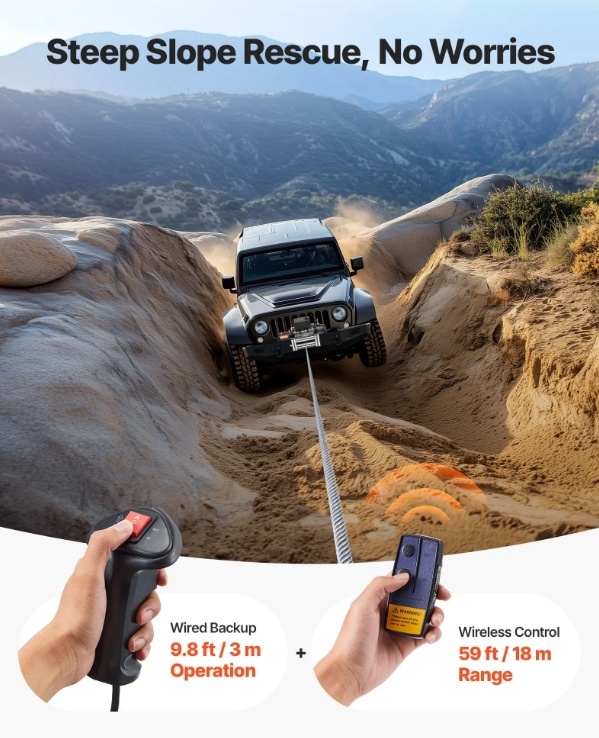 Droša tālvadības pults: 59 pēdu (18 m) garā vinčas bezvadu tālvadības pults ļauj atrasties drošā attālumā darbības laikā. Kā rezerves komplektā ir iekļauta 9,8 pēdu (2,7 m) gara vadu tālvadības pults, kas ir ideāli piemērota kalnu takām vai vietām ar vāju signālu.