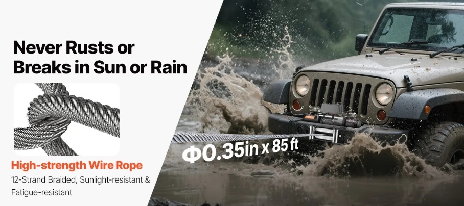 Izturīga pret visiem laikapstākļiem: 7/20 collu x 85 pēdu 12 pavedienu tērauda trose ir izturīga pret saules gaismu, nodilumu un lūzumiem. Pateicoties sakausējuma korpusam, kravas automašīnas vinča ir izturīga pret putekļiem, lietu un nelīdzenu reljefu.