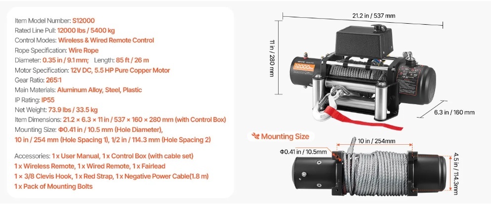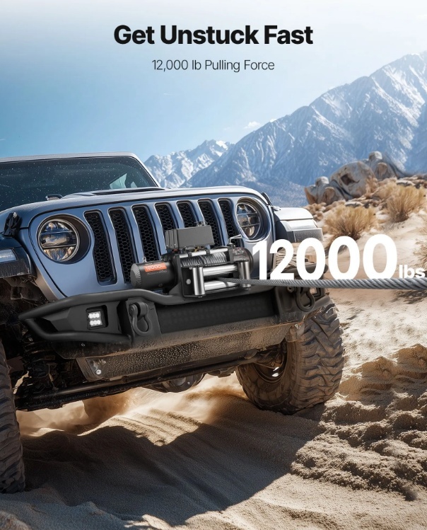 12 000 mārciņu (5 000 kg) spēcīga vilkšanas jauda: šī elektriskā vinča nodrošina 12 000 mārciņu (5 000 kg) vilkšanas spēku, padarot apvidus auto vai pikapa evakuāciju no dubļiem vai smiltīm ātru un bez stresa, neradot bažas par pārnesumu deformāciju.
