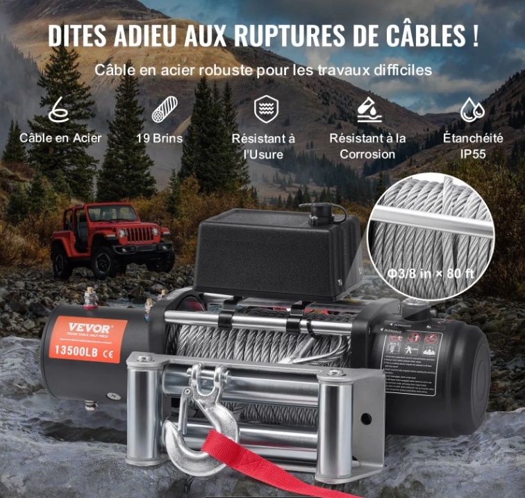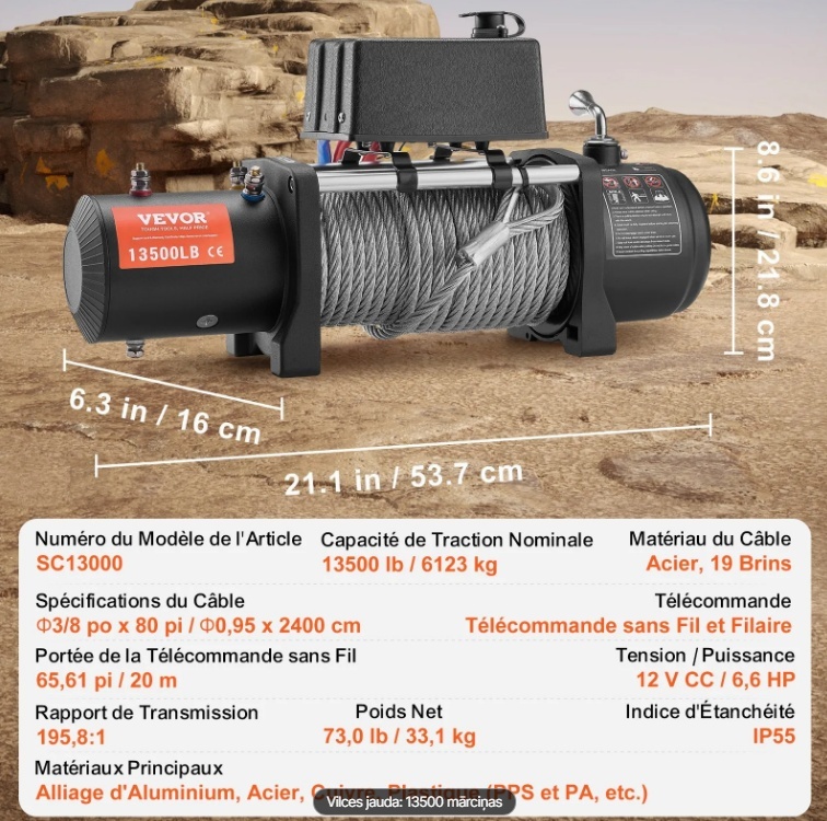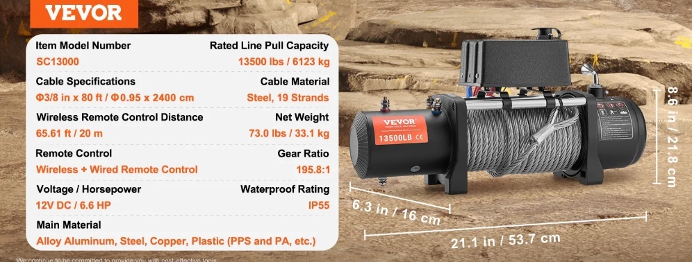 Īpaši izturīgajai kravas automašīnas vinčai ir 13500 mārciņu (7500 kg) vilkšanas jauda un IP55 ūdensnecaurlaidības klase, kas ir ideāli piemērota jūsu bezceļu transportlīdzekļu vai SUV atbrīvošanai no lipīgiem dubļiem vai stipra lietus. Ar 12 V līdzstrāvas/6,6 ZS vara motoru, 195,8:1 pārnesumu attiecību un tērauda trosi jūs vienmēr esat gatavs.