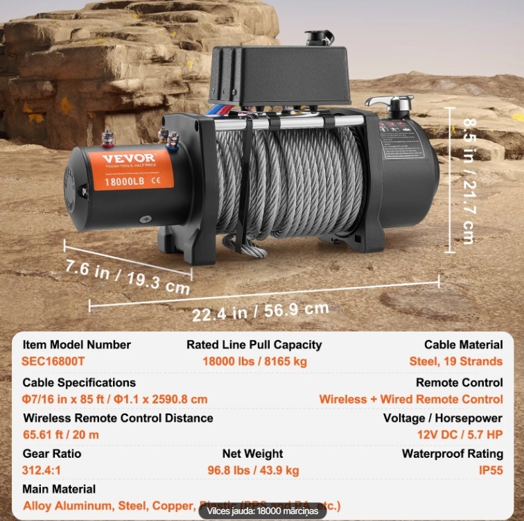 Īpaši izturīgajai kravas automašīnas vinčai ir 18 000 mārciņu (8 000 kg) vilkšanas jauda un IP55 ūdensnecaurlaidības klase, kas ir ideāli piemērota jūsu bezceļu transportlīdzekļu vai SUV atbrīvošanai no lipīgiem dubļiem vai stipra lietus. Ar 12 V līdzstrāvas/5,7 ZS vara motoru, 312,4:1 pārnesumu attiecību un tērauda trosi jūs vienmēr esat gatavs.