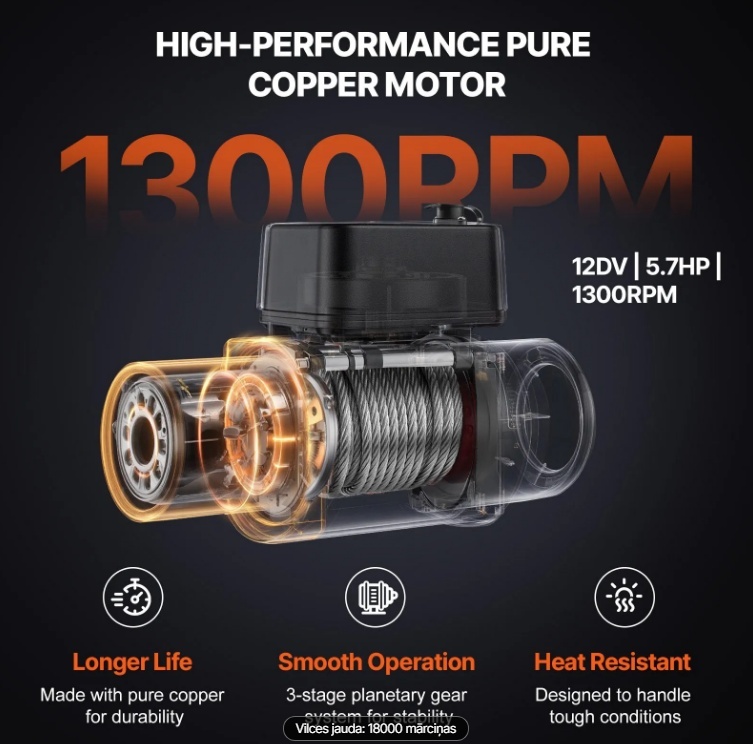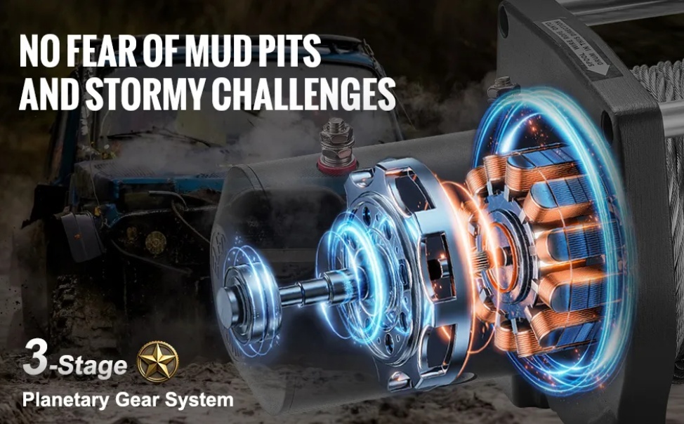 Elektrisko vinču darbina jaudīgs 12 V līdzstrāvas/5,7 ZS vara motors, kas vienmēr nodrošina pastāvīgu un efektīvu jaudu. Pateicoties uzlabotajai planētu pārnesumu sistēmai un 312,4:1 pārnesumskaitlim, jūs baudīsiet vienmērīgu un uzticamu troses vilkšanas spēju pat skarbos laika apstākļos vai dziļos dubļos.