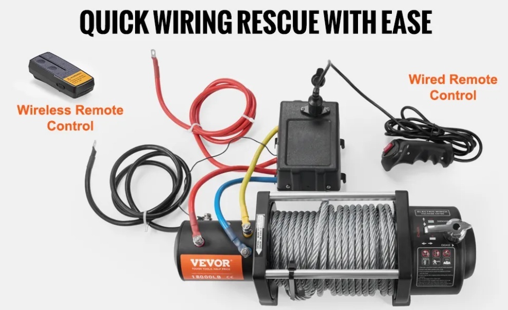 VEVOR elektriskā vinčas ar 8164 kg tērauda trosi, IP65 ūdensnecaurlaidīga tālvadības pults