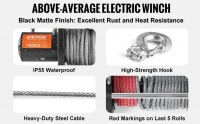 Elektriskā vinča kravas automašīnai ir izstrādāta ar augstas kvalitātes trosi, kurai uz pēdējiem 5 ruļļiem ir sarkanas atzīmes papildu drošībai. Tai ir IP55 ūdensnecaurlaidības klase un izturīga melna matēta apdare, tāpēc tā bez aizķeršanās iztur spēcīgu lietu un skarbus apstākļus.