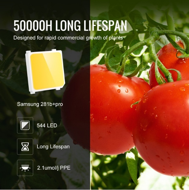 Augstas veiktspējas PPFD: kvalitāte ir mūsu prioritāte! Tas ir aprīkots ar augstākās kvalitātes Samsung 281B diodēm. Lielāks LED daudzums un jauns diožu izkārtojums ļauj augiem saņemt izturīgāku un vienmērīgāku gaismu. Patērē tikai 150 W, ideāli piemērots stādīšanai ar augstu ieguvumu.