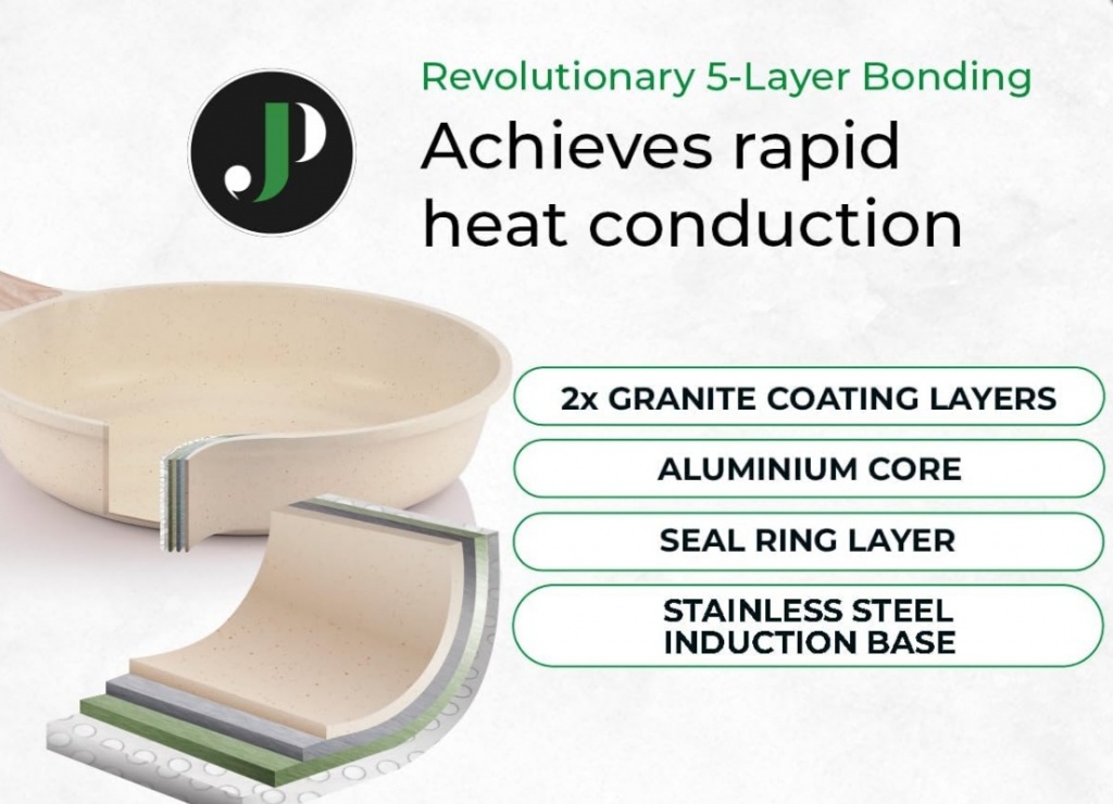 5. slānis: īpaša indukcijas pamatne, kas ir saderīga ar visiem siltuma avotiem, tostarp indukcijas plītīm.