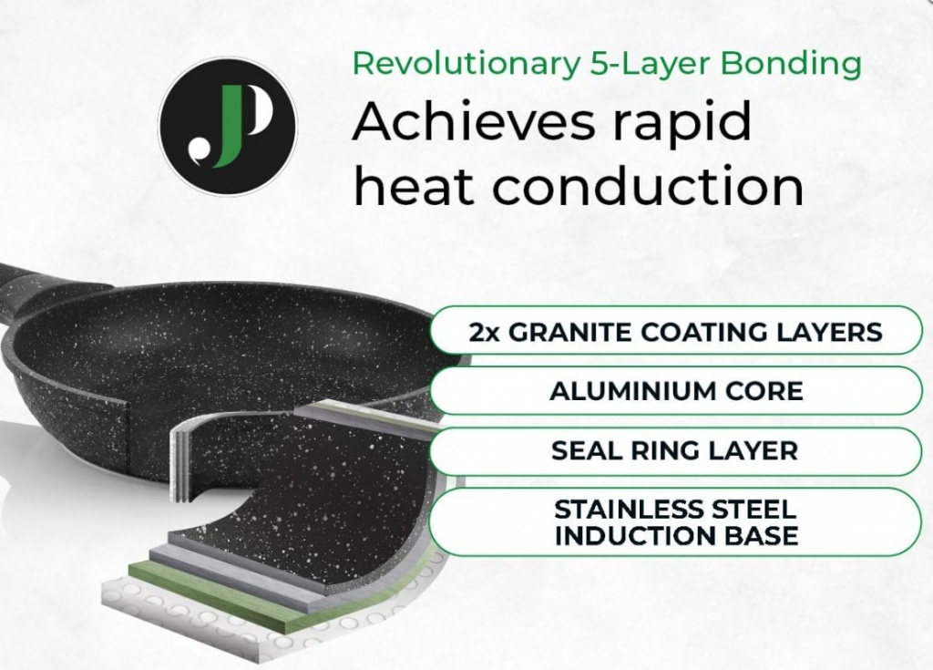 5. slānis: īpaša indukcijas pamatne, kas ir saderīga ar visiem siltuma avotiem, tostarp indukcijas plītīm.