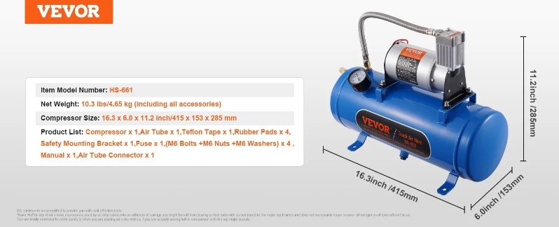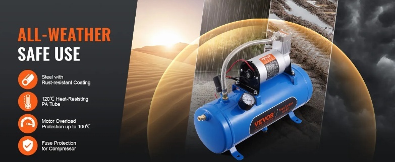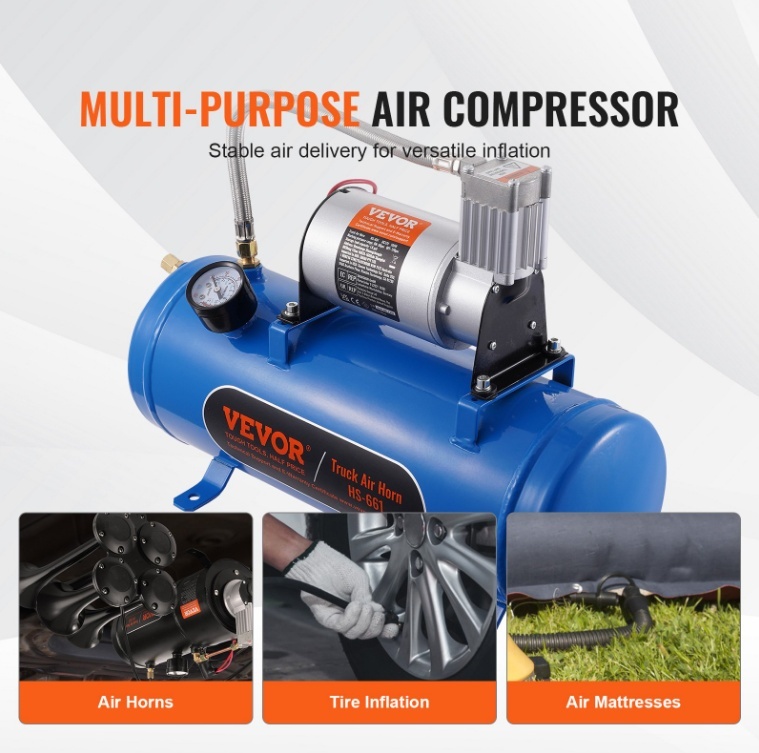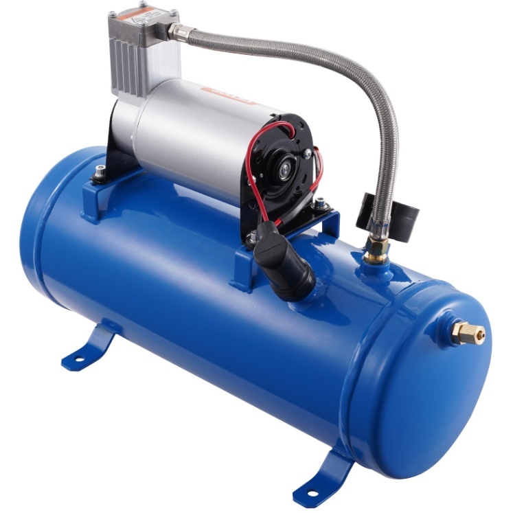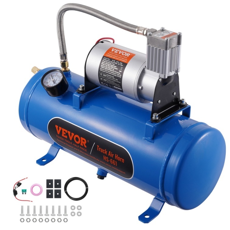Šajā borta gaisa kompresora komplektā ietilpst 1,6 galonu gaisa tvertne, kompresors un caurules. Kompresors ir paredzēts automātiskai darbībai, uzturot optimālu tvertnes spiedienu tā darba diapazonā. Lieliski piemērots dažādiem lietojumiem, tostarp gaisa taurēm, riepu piepūšanai un piepūšamo matraču piepūšanai.
