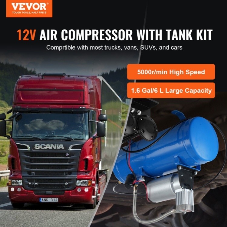 Gaisa kompresora 1,6 galonu tvertnes komplekts: Mūsu 12 voltu gaisa kompresora ar tvertni komplektā ietilpst gaisa tvertne, kompresors un cauruļu komplekts, sasniedzot efektīvu ātrumu 5000 apgr./min. Ātri nodrošina stabilu gaisa spiedienu, kas ir ideāli piemērots gaisa signāliem, riepu piepūšanai, gaisa matračiem un citiem priekšmetiem, ar minimālu troksni un bojājumu risku.