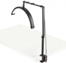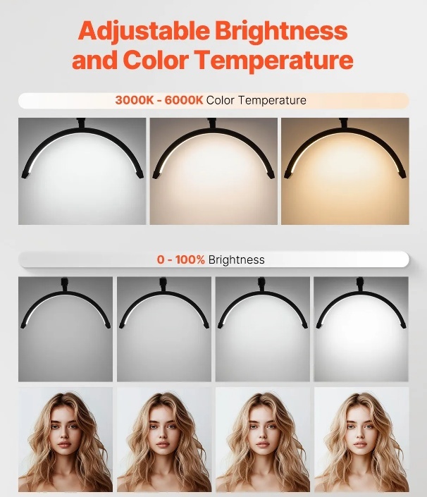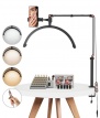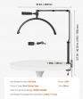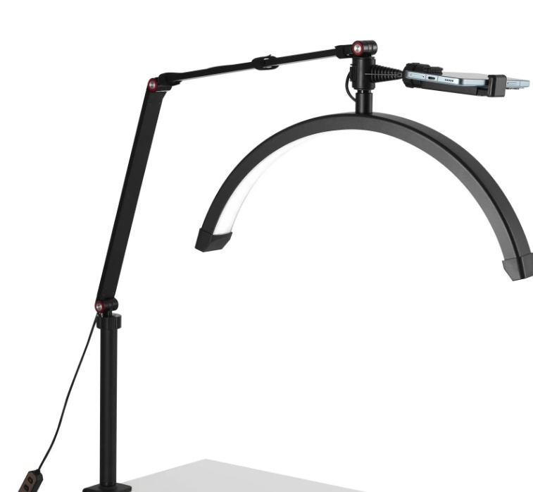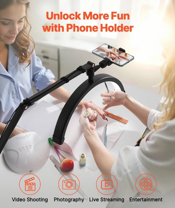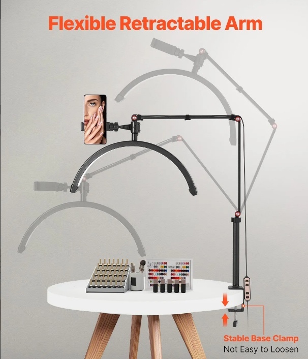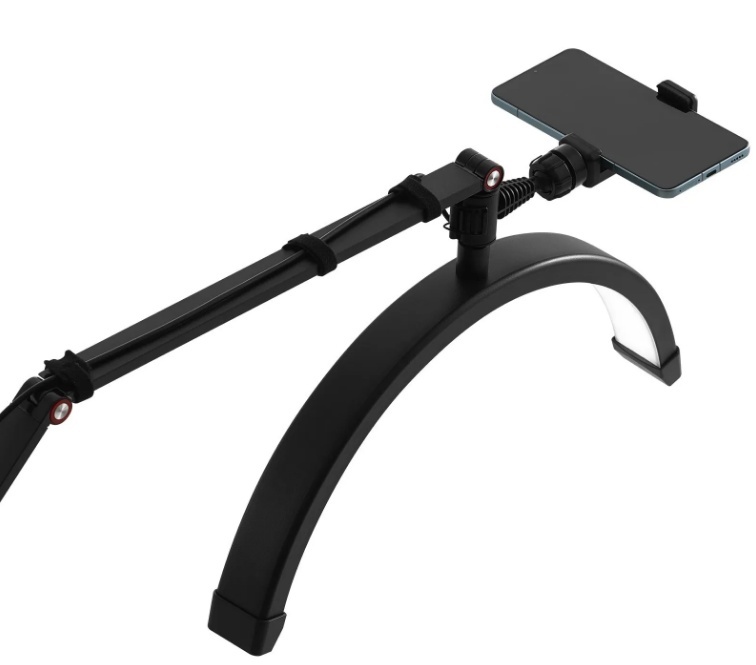 Elastīga roka un tālruņa turētājs: Pusmēness lampai ir C veida skava, kas īpaši paredzēta ierobežotām telpām. Lampas galva var pagriezties par 360°, savukārt roka ir elastīga un izvelkama, nodrošinot daudzpusīgas regulēšanas iespējas. Turklāt tai ir regulējams tālruņa turētājs, kas atvieglo video skatīšanos vai ierakstīšanu.
