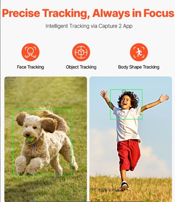Izmantojot viedās izsekošanas un žestu vadības funkcijas, varat viegli fiksēt objektu vai pārslēgt režīmus, izmantojot lietotni Capture2. 2600 mAh akumulators nodrošina 4 stundu darbības laiku ar ieslēgtām gaismām vai 7–9 stundas ar ieslēgtu gaismu un sejas izsekošanu pēc 3–4 stundu uzlādes. Uzņemiet attēlus bez drebēšanas jebkurā laikā un vietā.