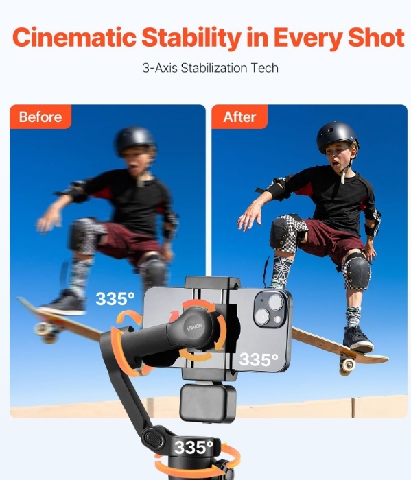 Nepārspējami stabila 3 asu stabilizācija: Pateicoties augstas precizitātes motoram un 335° rotācijas diapazonam uz katras ass, jūs varēsiet uzņemt kinematogrāfiskus video bez drebēšanas no jebkura leņķa neatkarīgi no tā, vai skrienat, braucat ar velosipēdu vai filmējat kustībā.