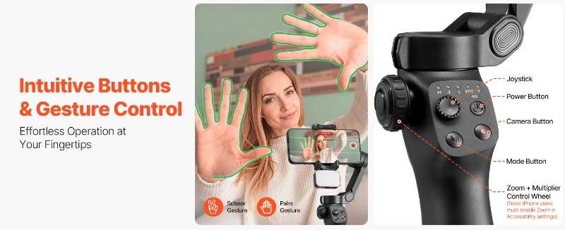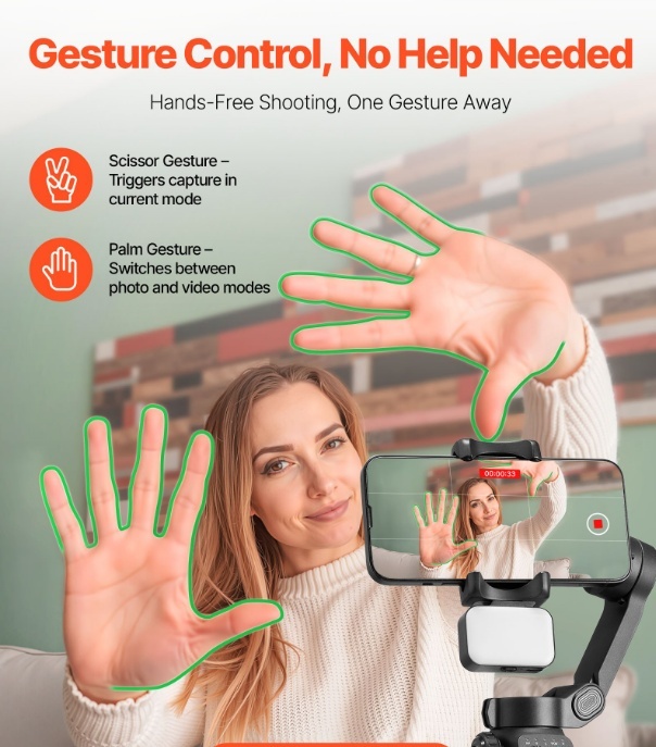 Iebūvētās pogas un viedā žestu vadība burtiski nodod varu jūsu rokās. Pārslēdziet režīmus vai uzņemiet fotoattēlus ar vienkāršu mājienu. Nav nepieciešama ekrāna pieskaršanās vai neveikla kustība — tikai vienmērīga, intuitīva darbība ērtai fotografēšanai ar mūsu 3 asu viedtālrunim paredzēto kardāna stabilizatoru.