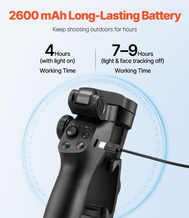 Fotografējiet ilgāk ar pārliecību: Šis 3 asu rokas stabilizators ar 2600 mAh akumulatoru uzlādējas 3–4 stundas un darbojas 7–9 stundas. Piemērots piedzīvojumiem brīvā dabā un ilgiem filmēšanas periodiem. Vairs nekādu akumulatora problēmu.