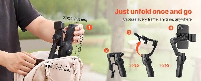Pietiekami kompakts, lai ietilptu somā vai pat kabatā — salocītā veidā tā izmēri ir tikai 5,12 x 2,32 x 4,96 collas. Neatkarīgi no tā, vai dodaties pastaigā pa pilsētu vai pārgājienā kalnos, šis 3 asu rokas kardāna stabilizators ir gatavs iemūžināt katru neaizmirstamo mirkli.