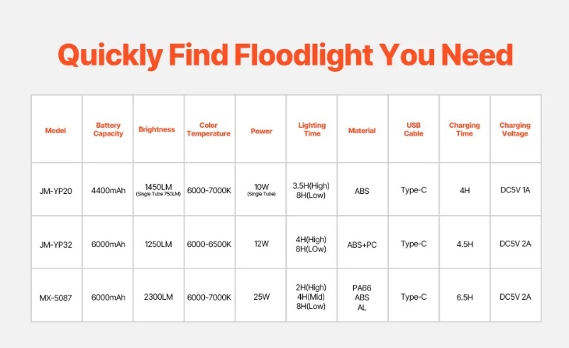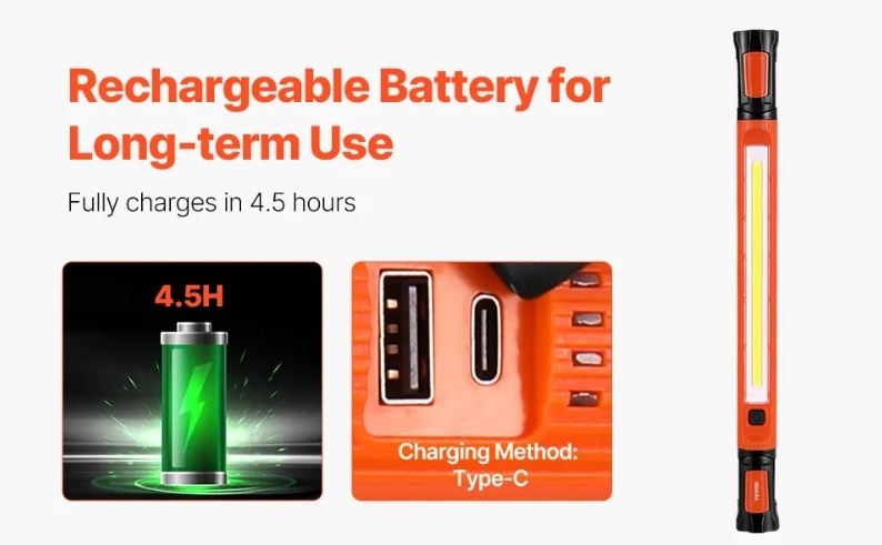 6000 mAh uzlādējams akumulators: Šis darba gaismas josla ir bezvadu un uzlādējama, izmantojot C tipa portu, tādējādi ietaupot papildu akumulatoru un nomaiņas izmaksas. Tas pilnībā uzlādējas 4,5 stundās un pēc pilnas uzlādes darbojas 4 stundas ar augstu jaudu un 8 stundas ar zemu jaudu.