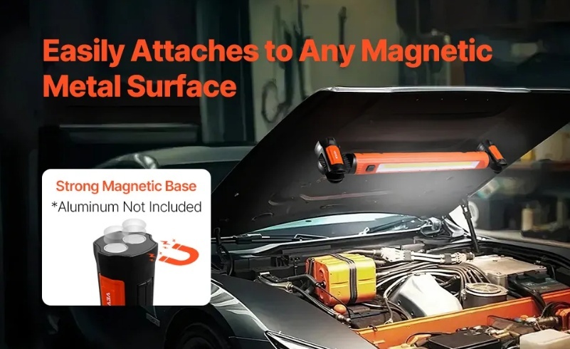 Bezvadu lietošanas ērtības: Šai mehāniskajai gaismas joslai ir spēcīga magnētiska pamatne, kas ļauj to piestiprināt pie pārsegiem vai magnētiskām metāla virsmām (izņemot alumīniju). Lai ērti izmantotu brīvroku režīmu, gaismu var arī pakārt pie āķiem, virvēm vai ķēdēm virs darba vietas. Daudzleņķu rotācija: Darba apgaismojumam zem motora pārsega ir 180° rotējoša pamatne un 360° rotējošs korpuss, kas ļauj viegli pielāgot gaismas leņķi pēc nepieciešamības. Nav nepieciešama bieža pārvietošana, tāpēc to ir viegli apgaismot tādās vietās kā zem automašīnas vai motora nodalījumā.