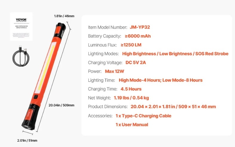 VEVOR servisa darba apgaismojums , 1250LM , 6000mAh , uzlādējams