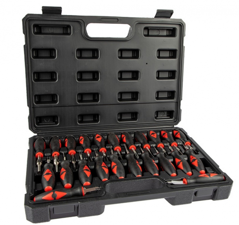 Informācija: 23 gab., bojājumu neradošai spaiļu un savienotāju atbloķēšanai, korozijas vai savienojuma defektu radītus bojājumus var ātri novērst, ļauj lietotājam viegli noņemt spailes no elektriskajiem savienotājiem un novērst vadu un spaiļu bloku bojājumus, individuāli marķēti rokturi ērtai identificēšanai ar lietošanas tabulu. Universāls Eiropas spaiļu instrumentu komplekts, piemērots: BMW, Mercedes, VW, Audi, Jaguar, Porsche, Saab, Skoda, Ford, Renault, Citroen, Chrysler, Flat, Honda, Mazda, Mitsubishi, Toyota, Opel, Seat