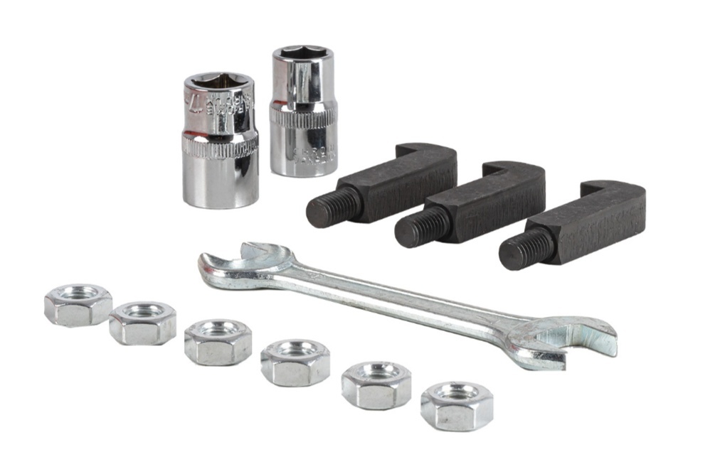 Āķu sistēma: Komplektā ietilpst dažādi maināmi āķi un sviras ar dažādiem profiliem, kas ļauj satvert gultņus, zobratus un bukses no iekšpuses vai ārpuses.