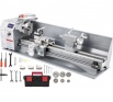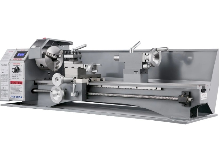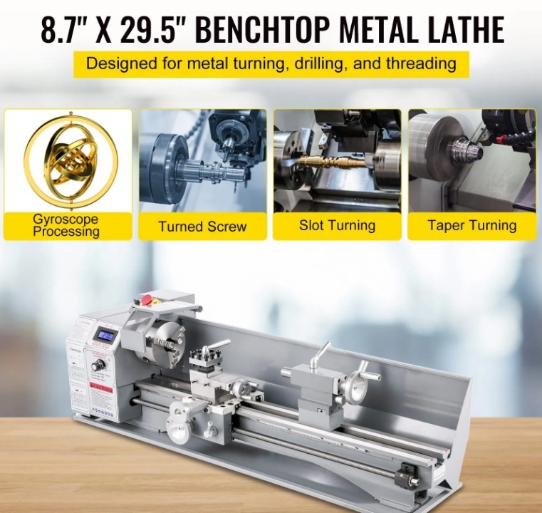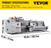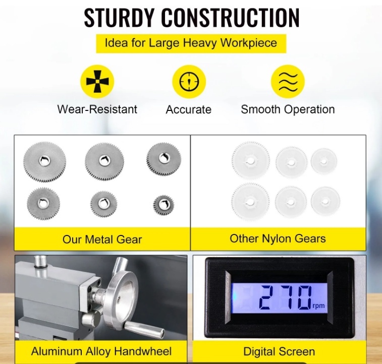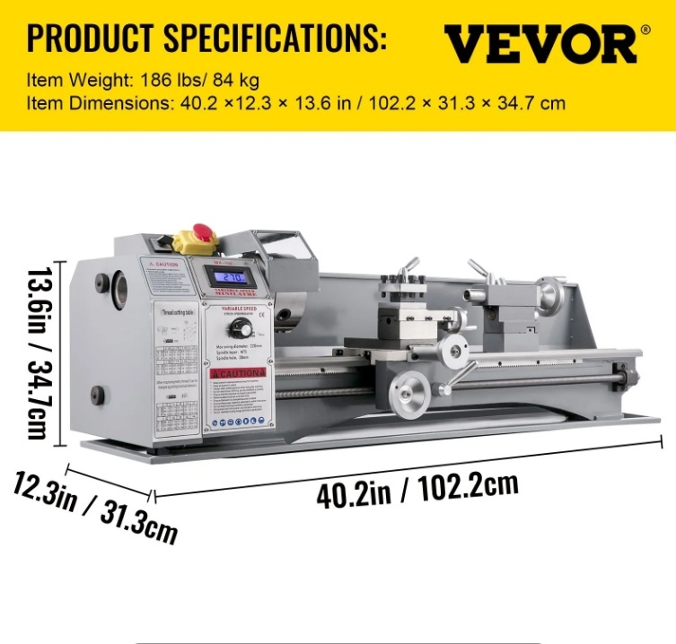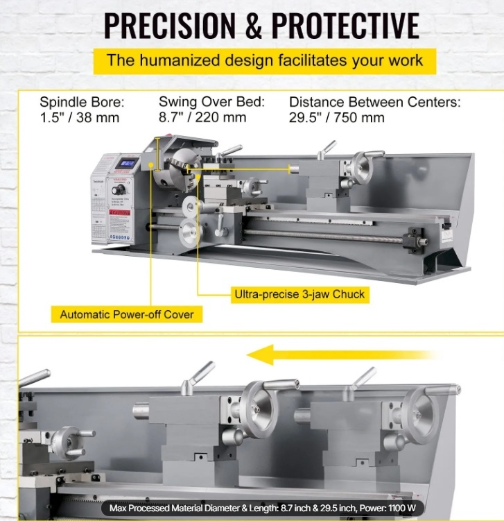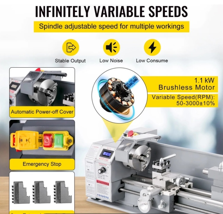 Bezgalīgi maināms ātrums: Mini metāla virpu darbina līdzstrāvas motors ar jaudu: 1100 W. Maināms ātrums (apgr./min): 50–2250 ± 10 %. Vārpstas priekšgala konuss: MT5. LED ekrāns skaidri un precīzi parāda ātrumu precīzam darbam. Lēna iedarbināšana, pārslēgšanas slēdzis pulksteņrādītāja virzienā vai pretēji pulksteņrādītāja virzienam. Darbiniet manuāli vai ar regulējamu automātisko padeves ātrumu. 750 mm liels pagrieziena diapazons: Galda virpai ir 3 žokļu patrona ar diametru: 4,9 collas/125 mm. Pagrieziena diapazons virs pamatnes: 8,7 collas/220 mm un pagrieziena diapazons virs šķērsslaida: 29,5 collas/750 mm, kas piedāvā vairāk iespēju lieliem un/vai smagiem sagatavēm. Vārpstas priekšgala konuss: MT5. Imperatora vītņu diapazons: 8–44 TPI.