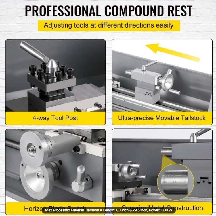 Profesionāls saliktais balsts: Mini virpas ātrās nomaiņas instrumenta balsts var sasniegt iekšējās griešanas, virsmas griešanas un slīpās griešanas pozīcijas, mainot instrumenta balsta leņķi un regulējot salikto balstu, brīvi pārvietojot asmeņus ar padeves stieni. Termiski rūdāma vadošā skrūve.