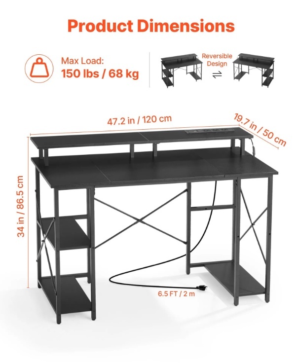 Uzlabojiet savu darba vietu: Šim datorgaldam ir iebūvēta strāvas padeves josla ar 4 trīszaru kontaktligzdām, 2 USB portiem un 2 m garu strāvas vadu ierīcēm, kā arī apgriežamu uzglabāšanas plauktu, ko var uzstādīt pa kreisi vai pa labi, lai tas atbilstu jūsu iestatījumiem.