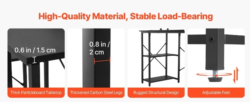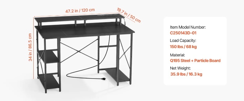 Spēcīga slodzes izturība un stabilitāte: 1,5 cm skaidu plātnes galda virsma var izturēt svaru līdz 68 kg, gludā virsma ir izturīga pret ūdens traipiem un skrāpējumiem un viegli tīrāma, nodrošinot stabilu darba virsmu datoram, grāmatām un piederumiem.