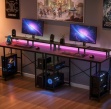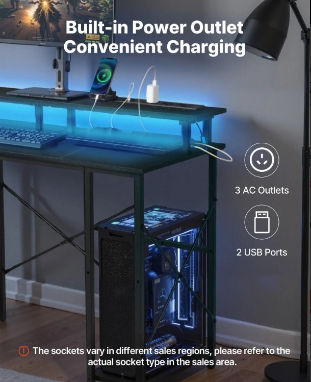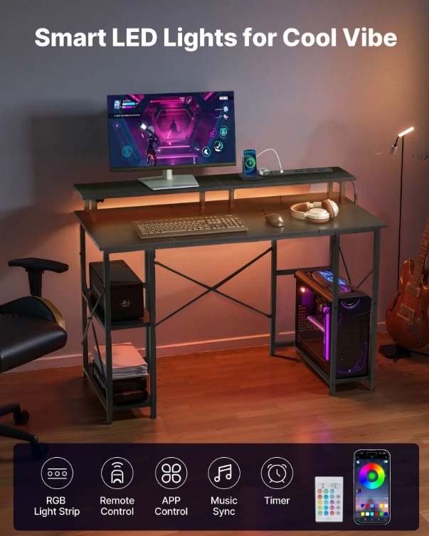 VEVOR 120 cm datorgalds ar viedajām LED gaismām un strāvas rozetēm