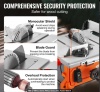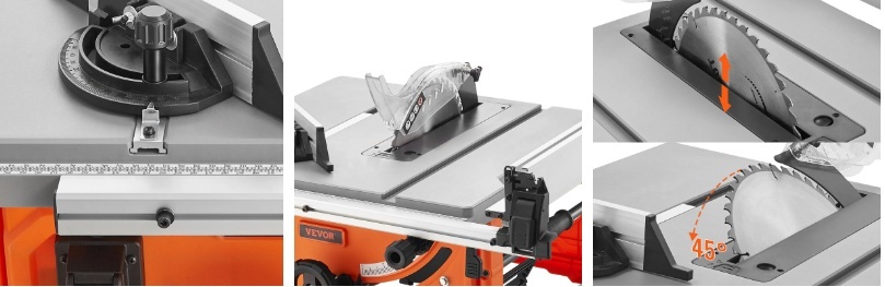 Griešana dažādos leņķos: Ar regulējama, pilna garuma paralēla vadotnes ar mērīšanas vadotni palīdzību mūsu galda zāģis nodrošina uzticamu un vienmērīgu garengriezumu katru reizi. Jūs būsiet ļoti apmierināts ar rezultātiem. Jūs varat iestatīt asmeni jebkurā vēlamajā leņķī no -60° līdz 60° slīpai griešanai. Saglabājiet kontroli un grieziet visizplatītākajos leņķos neatkarīgi no apstākļiem.