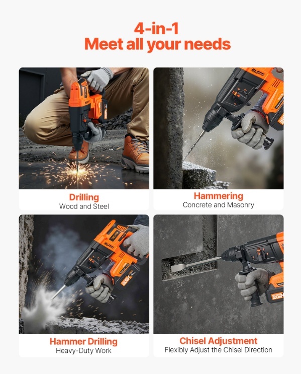 VEVOR 20V SDS-Plus bezsuku akumulatora urbmašīnas komplekts 1200 apgr./min. 4 funkcijas