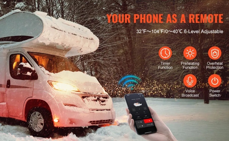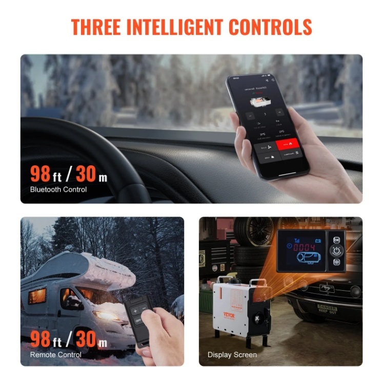 Viedās vadības iespējas: Mūsu dīzeļdegvielas automašīnas sildītājs ir aprīkots ar 3 vadības metodēm: Bluetooth lietotni, tālvadības pulti un displeja paneli. Jūs varat vadīt un uzraudzīt savu sildītāju tieši no viedtālruņa. Viegli pielāgojiet temperatūras iestatījumus intuitīvai un ērtai sildīšanas pieredzei.