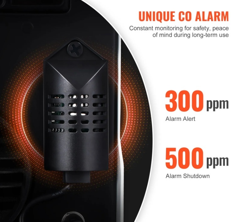 Šis dīzeļdegvielas gaisa sildītājs ir aprīkots ar inovatīvu CO trauksmes sistēmu, kas nepārtraukti uzrauga oglekļa monoksīda līmeni. Brīdinājumi tiek aktivizēti, sasniedzot 300 ppm, un automātiski izslēdzas, sasniedzot 500 ppm, lai novērstu CO saindēšanos nepilnīgas sadegšanas dēļ.