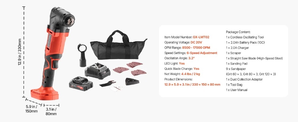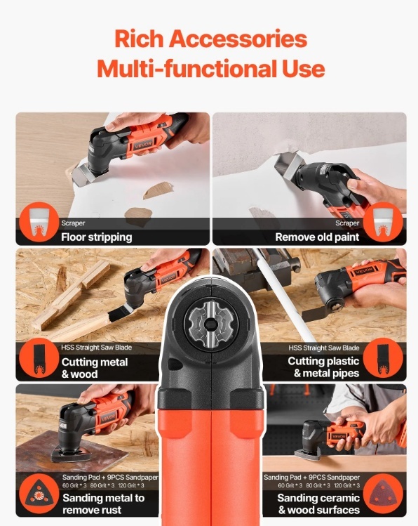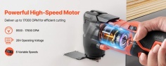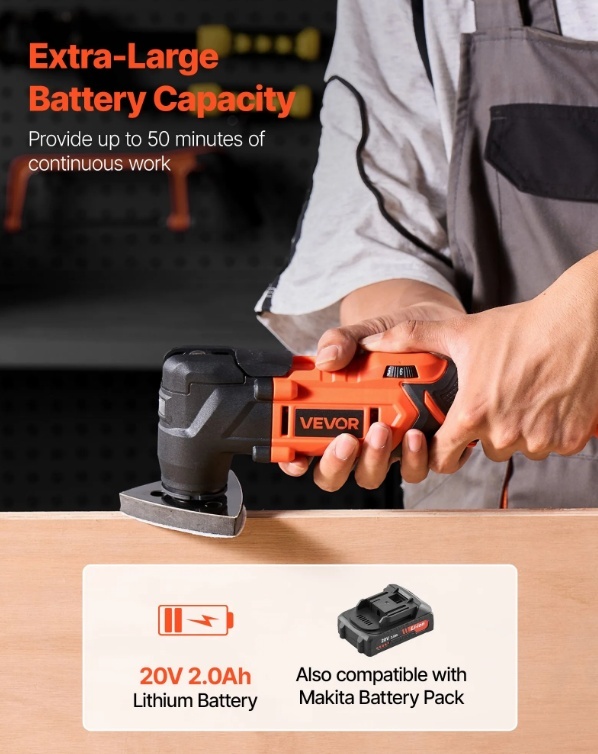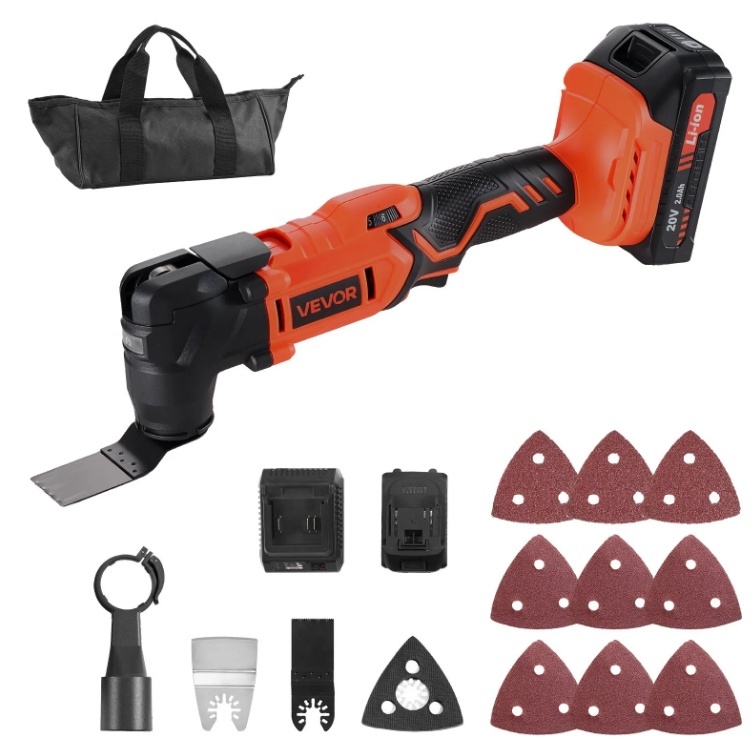 VEVOR 20 V akumulatora oscilējošais instruments ir aprīkots ar dažādiem zāģa piederumiem, lai viegli veiktu slīpēšanu, griešanu, skrāpēšanu un citus uzdevumus. Tam ir 6 ātrumi no 8500 līdz 17 000 apgriezieniem minūtē, ātra asmens nomaiņa, 2,0 Ah akumulators un lādētājs — ideāli piemērots mājas uzlabošanai, kokapstrādei un “dari pats” projektiem.