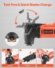 Ātra asmens nomaiņa: Mūsu oscilējošajam instrumentam ir bloķēšanas svira, kas ļauj ātri nomainīt stiprinājumus, neizmantojot uzgriežņu atslēgu. 1. darbība: paceliet vadības sviru līdz 180° grādiem. 2. darbība: uzstādiet asmeni. 3. darbība: nofiksējiet sviru vietā.