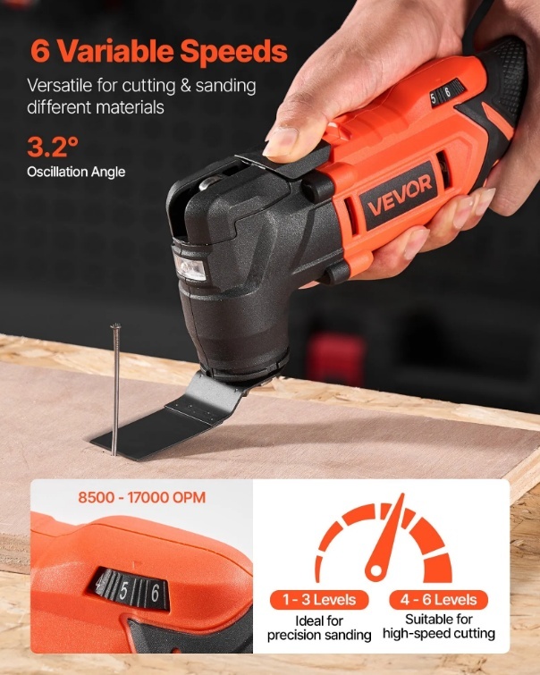 6 maināmi ātrumi: Šim oscilējošajam instrumentam ir 3,2° svārstību leņķis un 6 ātrumu iestatījumi (no 8500 līdz 17 000 apgriezieniem minūtē), kas ir piemēroti slīpēšanai, skrāpēšanai, vecās krāsas noņemšanai, grīdas seguma noņemšanai, koka, plastmasas cauruļu, mīksto metālu, piemēram, lokšņu dzelzs, alumīnija, vara cauruļu griešanai (nav ieteicams cieto metālu, piemēram, nerūsējošā tērauda, griešanai).