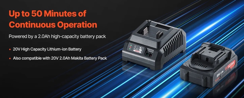 Bezvadu un pārnēsājams: Aprīkots ar 20 V 2,0 Ah lielas ietilpības litija akumulatoru un 2 A akumulatora lādētāju, šis bezvadu oscilējošais zāģis nodrošina ilgu darbības laiku ar pilnu uzlādi. Tas ir saderīgs arī ar Makita akumulatoru blokiem.