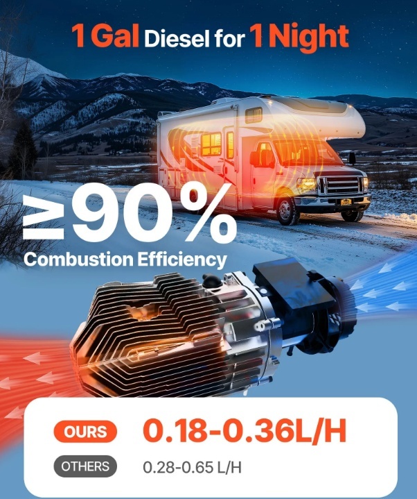 Nav jāuztraucas par pārmērīgu degvielas patēriņu garu braucienu laikā ar kemperi. Mūsu dīzeļdegvielas gaisa sildītājam ir iespaidīga degvielas efektivitāte ≥90%, nodrošinot, ka katrs dīzeļdegvielas piliens tiek pilnībā izmantots. Visai nakts apkurei nepieciešams tikai 1 galons dīzeļdegvielas.