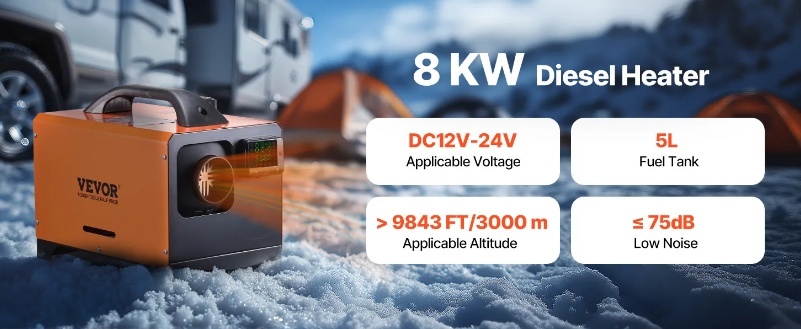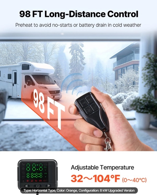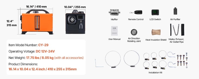 Efektīva sildīšana: Šis 8 kW dīzeļdegvielas sildītājs darbojas ar 12 V–24 V līdzstrāvu un ir piemērots platībām no 161 līdz 215 pēdām (apmēram 56–94 m²). Keramikas aizdedzinātājs nodrošina ātru iedarbināšanu aukstā laikā, paaugstinot temperatūru jūsu transportlīdzeklī, kemperī, laivā un citur.