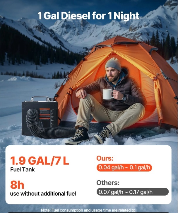 Degvielas taupīšana: Šim pārnēsājamajam dīzeļdegvielas sildītājam ir kluss, enerģiju taupošs degvielas sūknis, un tas sadedzina 0,04–0,1 gal/h ar vairāk nekā 90 % efektivitāti. 1,9 galonu degvielas tvertne nodrošina apsildi visu nakti bez degvielas uzpildes, samazinot degvielas patēriņu un enerģijas izšķērdēšanu.