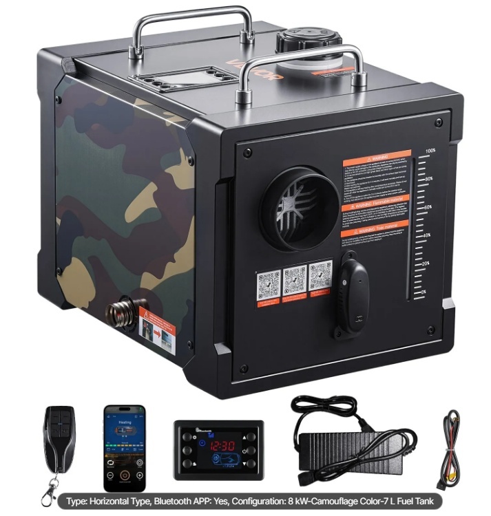 Šis 8 kW pārnēsājamais dīzeļdegvielas sildītājs tiek pievienots transportlīdzekļa elektrotīklam un komplektā ietilpst adapteris elektrostacijām vai mājsaimniecības maiņstrāvas tīklam. Tas nodrošina ātru un efektīvu apsildi teltīm, zemledus makšķerēšanai, kemperiem, kravas automašīnām, apvidus automašīnām, furgoniem un citām automašīnām. Tas ir paredzēts darbam aukstā vidē un ātri sasilda lielas telpas.