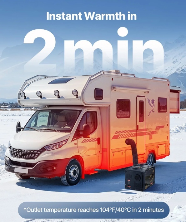 Ātra uzsildīšana: Mūsu 8 kW dīzeļdegvielas sildītājs uzsilda telpas 108–161 ft² platībā, sasniedzot līdz 210 ℉ 5 minūtēs un radot komfortablu transportlīdzekļa salonu 10 minūtēs. Tas darbojas ar 12 V/24 V barošanu vai 220 V kontaktligzdu. Viss vienā dizains atvieglo tā pārnēsāšanu.