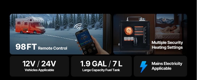 Bluetooth lietotnes vadība: Šis dīzeļdegvielas sildītājs atbalsta Bluetooth lietotnes vadību no attāluma līdz pat 98 pēdām. Izmantojiet tālruni, lai iestatītu taimerus, uzsildītu un regulētu temperatūru (46,4–96,8 ℉). Var vadīt arī ar tālvadības pulti un LCD ekrānu papildu ērtībai.