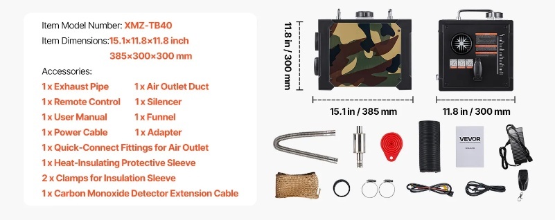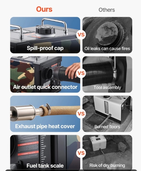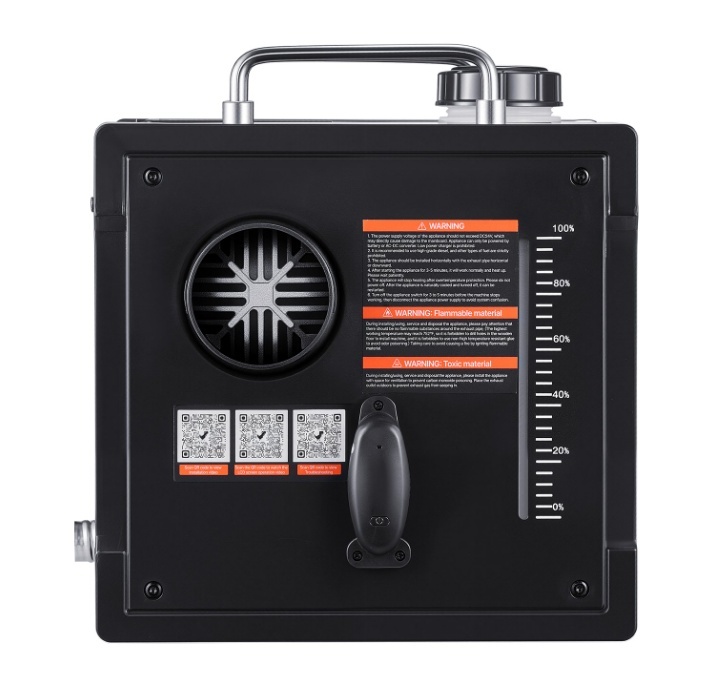 Drošības funkcijas: Šis dīzeļdegvielas gaisa sildītājs ir uzlabots ar CO signalizāciju, izplūdes caurules siltuma uzmavu un noslēgtu degvielas vāciņu drošai ilgstošai lietošanai. Iekšējā plate ietver pārkaršanas atslēgšanu (≥536 ℉), apgrieztu polaritāti un pārsprieguma aizsardzību.