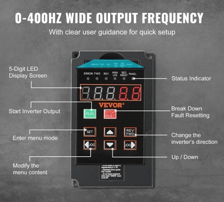 VEVOR 2HP VFD ir aprīkots ar intuitīvu displeju. Tam ir lietotājam draudzīgas pogas ērtai vadībai. Displejā ir redzama skaidra informācija reāllaikā. Jūs varat viegli uzraudzīt un pielāgot iestatījumus. Šīs pogas ir paredzētas ātrai darbībai. Tas padara VEVOR lietotājam draudzīgu. Mūsu atdalītais panelis nodrošina papildu ērtības. Tas ļauj veikt tālvadību. Šī funkcija ir lieliska elastības ziņā. Mēs varam pārvaldīt VEVOR no attāluma. Intuitīva saskarne ietaupa laiku. Tā vienkāršo iestatīšanas procesu. Lietotāji var to viegli pārvaldīt, padarot to pieejamu dažādiem prasmju līmeņiem.
