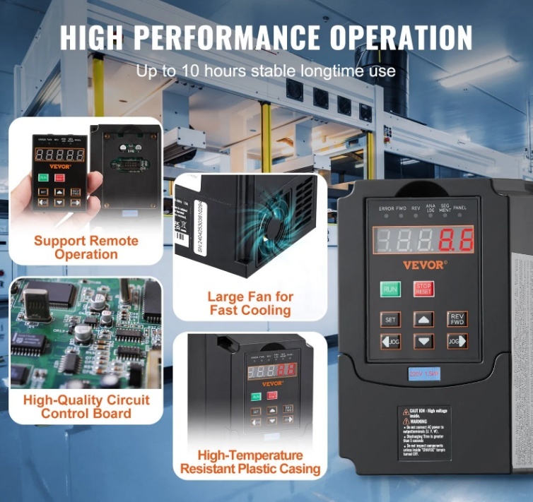 Šī funkcija uzlabo vadību. VEVOR veiktspēja ir izcila. Tas atbalsta 220 V ieeju un tā izejas diapazons ir no 0 līdz 400 Hz. Tas nodrošina stabilu darbību. Mūsu VEVOR izejas jauda ir nemainīga. Jūs varat efektīvi apstrādāt dažādas slodzes. Jūsu ierīces veiktspēja ir uzticama. Tā atbilst dažādām darbības vajadzībām. 220 V ieeja ir daudzpusīga. Mēs atbalstām gan vienfāzes, gan trīsfāžu iestatījumus. 0–400 Hz izejas diapazons nodrošina elastīgas funkcijas. Pateicoties tā elastīgajam izejas diapazonam, jūs varat pielāgot motora ātrumu pēc nepieciešamības. VEVOR kvalitāte nepieviļ tā veiktspējā. Tie ir izstrādāti uzticamībai. Tāpēc tas būs uzticams instruments daudzās nozarēs.