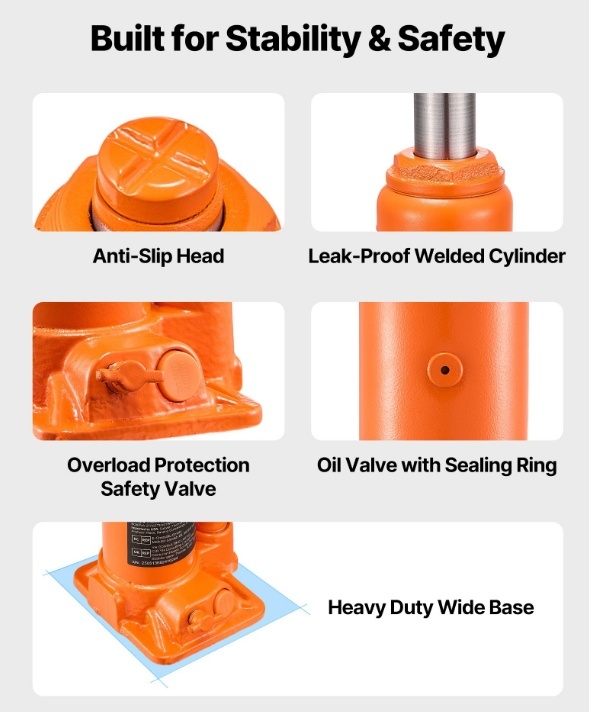 Drošs un bez noplūdēm: Mazais domkrats ir izgatavots no izturīgiem materiāliem ar stabilu balstu, kas paliek stabils. Iebūvētais vārsts palīdz izvairīties no pārslodzēm, un metinātais korpuss ar gumijas blīvējumu eļļas atverē nozīmē, ka laika gaitā neradīsies netīras noplūdes.